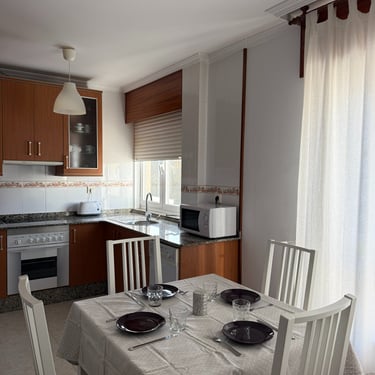 Cocina conectada al salón (vitrocerámica, horno, microondas, lavavajillas, nevera, congelador, vajilla)